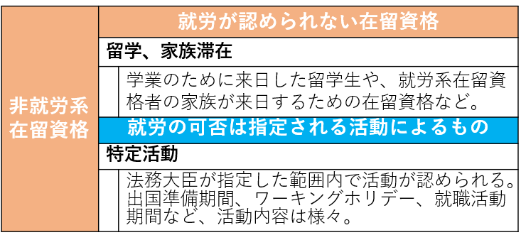 入管法は「就労」のうち、代替的業務(単純労働)、例えば飲食店のウエイトレス、コンビニのレジ担当、清掃員、建設業の現場作業などを認めていません。これらの業務に従事できるのは、「身分・地位に基づく在留資格」を有する者、「留学」「家族滞在」などの資格を有する者で「資格外活動許可」を得ている者(週28時間まで)、「特定活動」の資格を有する者などに限定されます。
