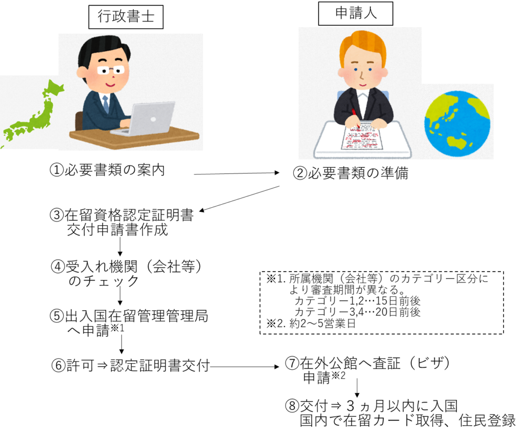 出入国在留管理局へ(新潟は「東京出入国在留管理局新潟出張所」)「在留資格認定証明書交付申請」を行います。申請人(外国人)が日本への入国前に、「在留資格認定証明書」を添付のうえ、母国の在外公館にて「査証(ビザ)」申請を行います。「査証(ビザ)」受領後、3ヵ月以内に日本に入国します。
