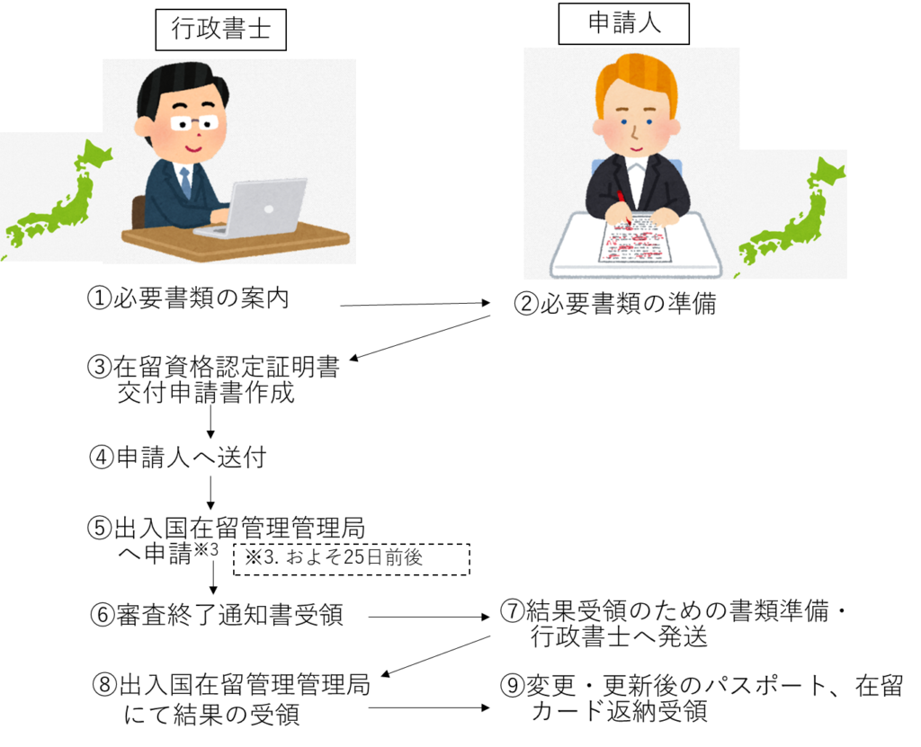 また、在留期間満了に伴う「在留資格更新許可申請」についても、基本的な流れは「在留資格変更許可申請」と同じです。