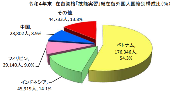 「在留資格」で在留する外国人の構成比は、令和4年末現在、①ベトナム、②インドネシア、③フィリピンの順となっています。